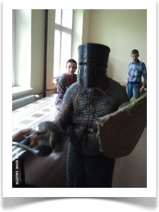 WARSZTATY WALKI MIECZEM My, rycerska brać… Może nie tak do końca, że niby rycerze pełną gębą, ale otarliśmy się o średniowiecze i ówczesnych rycerzy. A stało się to za sprawą Waszmościa Sebastiana „Boguty” Bogusza, który przyjął nas w poczet mężów pragnących stać się wojami co się zowie. I tak każdego czwartku internat ośrodka pustoszał, bo prawie wszyscy osobnicy rodzaju męskiego, kto żyw, ciągnął karnym szeregiem do oddalonego parę kilometrów grodu na nauki. Nie zważano na nic- ani na pogodę (żar z nieba lub groźne chmury na horyzoncie), ani na cielesne niedomagania - patrz kulejący Michał „Lesiu” lub istne skonanie po turnieju hokeja halowego. Tam, na miejscu, młodzi adepci rycerskiej sztuki, pomimo wszelakich słabości ciała i ducha, z wielkim upodobaniem i zacięciem oddawali się szlifowaniu rycerskich umiejętności. A były to na przykład: x kroki i postawy waleczne - szło nam znakomicie i doskonale, gdyby tylko nie ta nieszczęsna lina rozciągnięta pośrodku sali: ciągle nas z niej znosiło na boki i odrobinkę plątały się nam nogi, ale ogólnie było super. Ofiar w ludziach w tym miejscu nie było, x saluty i podziękowania rycerskie za dobrą walkę - to drugie czyniliśmy nieźle i z radością, tym większą, jeśli udało się przeciwnikowi dołożyć, x rzucanie oszczepem ( nadspodziewanie ciężkim) - było bardzo dobrze, bo za każdym razem oszczep lądował tam, gdzie trzeba, czyli przed nami. W ten sposób ocaleli wszyscy. x szyki bojowe - było very super, w rękach dzierżyliśmy tarcze, trzymaliśmy się zwarcie, słychać było tumult, głośne okrzyki i kwiczenie - nie, nie, nie zarzynanych, ale nasze, ze śmiechu. Nikt nie został zadeptany ani w inny sposób poturbowany -ofiar w ludziach nie odnotowano, x zakładanie rynsztunku rycerskiego, najprawdziwszego z prawdziwych, słowo honoru ! Kolczuga była spoko, nie gryzła, nie drapała. Ale już hełm ?! Ważył chyba pół tony! (Czapki są jednak zdecydowanie wygodniejsze na co dzień) Trudno nam było utrzymać pozycję pionową, ale jak się już nie zataczaliśmy pod ciężarem rycerskiego nakrycia głowy, to dostawaliśmy tarczę do jednej ręki i miecz do drugiej. Miecz, jako że też prawdziwy, też swoje ważył i znowu braliśmy przechył na różne strony. Aha, a na dłoniach to mieliśmy takie galantne rękawice uzbrojone metalowymi kółeczkami, co by nam wróg tychże dłoni z mieczem nie odrąbał. Brrr…Straszne. Przeżyli wszyscy, strat żadnych w ludziach nie było. Jak już jakimś cudem trzymaliśmy pion przez dłuższy czas, nadchodziło kolejne wyzwanie - groźny, czarny przeciwnik w postaci opony zawieszonej na drągu. O, jakże podstępny i przebiegły był ten wróg - kołysał się, wychylał na boki, kręcił się nieustannie, nijak nie pozwalał sobie porządnie przyłożyć. Szydził z nas dosłownie szczerząc przy tym szyderczo swój bieżnik. Robiliśmy co mogliśmy stosując metodę chybił-trafił z przewagą tej pierwszej. Jakie to szczęście, że ten potwór nie miał miecza. Byłaby masakra! A tak- znów udało się nam wszystkim ujść z życiem. Na jednych z zajęć mogliśmy się zmierzyć z samym Mistrzem- to dopiero było przeżycie - stoczyć walkę w stroju rycerskim. Szło nam znakomicie, byliśmy wspaniali! No dobrze, przyznajemy się, pan Sebastian był górą. Trochę oberwaliśmy i to w miejsca, gdzie najmniej się tego spodziewaliśmy. Dobrze, że walczyliśmy tylko palcatami i że Mistrz był litościwy i oszczędny w wymierzanych razach. Słowem: udało się ocalić, ofiar w ludziach nie odnotowano. x Były raz tańce dworskie - szło nam ogólnie nieźle, tylko był pewien problem, bo „w prawo” niekoniecznie oznaczało to samo dla wszystkich, a co do: „w lewo” to kolega z boku miał zawsze inne przekonanie. Jedynie pan Sebastian tańczył nie myląc ani razu nóg, tańczył niewzruszenie patrząc na nas wyrozumiale i… chyba trochę z politowaniem. Ale tego nie jesteśmy pewni. W każdym bądź razie, co do osoby pana Bogusza, tylko wybitny refleks i doświadczenie w wielu walkach i turniejach pozwoliły mu zachować nienaruszony połysk na butach do samego końca tańców dworskich. No, i trzeba przyznać, że i jeszcze pani Basia próbowała poprawnie przebierać nogami, ale dosyć skutecznie jej to utrudnialiśmy i dala sobie spokój. Zresztą, co jakiś czas (zdecydowanie za często jak na nasz gust) podskakiwała wyżej niż trzeba i popiskiwała coś tam, jakieś „Moje palce!” albo „Moje odciski!” Stanowczo, naszym zdaniem, baby się na rycerzy nie nadają i już! Ogólnie rzecz ujmując, strat w ludziach kolejny raz udało się uniknąć, jedynie co niektórzy nieznacznie kuśtykali w drodze powrotnej. Poznaliśmy sztukę ukłonów, równie dworskich, co i skomplikowanych. Szło to jakoś tak: jedna ręka na plecach, druga od serca zaczyna wywijać wdzięczną, potrójną pętlę w kierunku podłogi. W tym samym czasie następuje ukłon uniżony, a do tego trzeba cały czas patrzeć w oczy uwielbianej damy bez mrugnięcia, a za to z miłością i oddaniem. Uff…Przeżyliśmy i to. A dzisiaj to wystarczy rzucić „Chodź, mała”, więc już nie wiemy, które czasy były lepsze pod tym względem. Pan Sebastian podczas wszystkich zajęć prezentował iście anielską cierpliwość i opanowanie godne co najmniej 10-ciu oligofrenopedagogów wziętych razem do kupy. I tylko jednemu z nas udało się go wytrącić na moment ze stoickiego spokoju. Tego wyczynu dokonał kolega roztrzaskując atrapę szpady w drobniusieńki mak na tarczy przeciwnika. Mistrz był niepomiernie zaskoczony. My też. Zapadła niezręczna cisza. Ale Mistrz -jak to Mistrz - wzniósł się ponad poczynione spustoszenie i pozwolił delikwentowi na zrehabilitowanie się. W miejsce szpady wręczył mu stalowy miecz i nakazał atak na oponę (dobrze jej tak). Miecz przetrwał w całości, opona, skubaniutka,