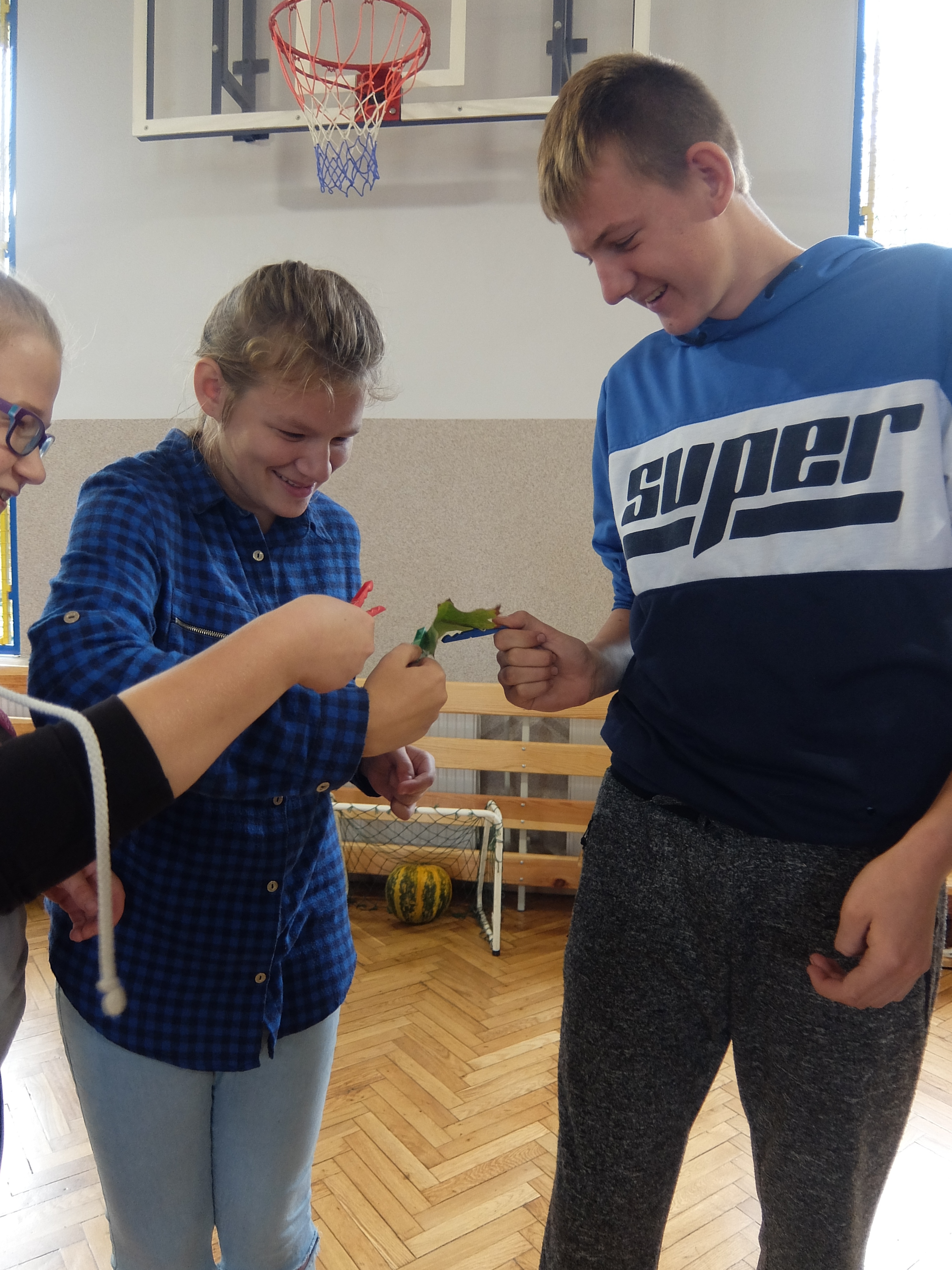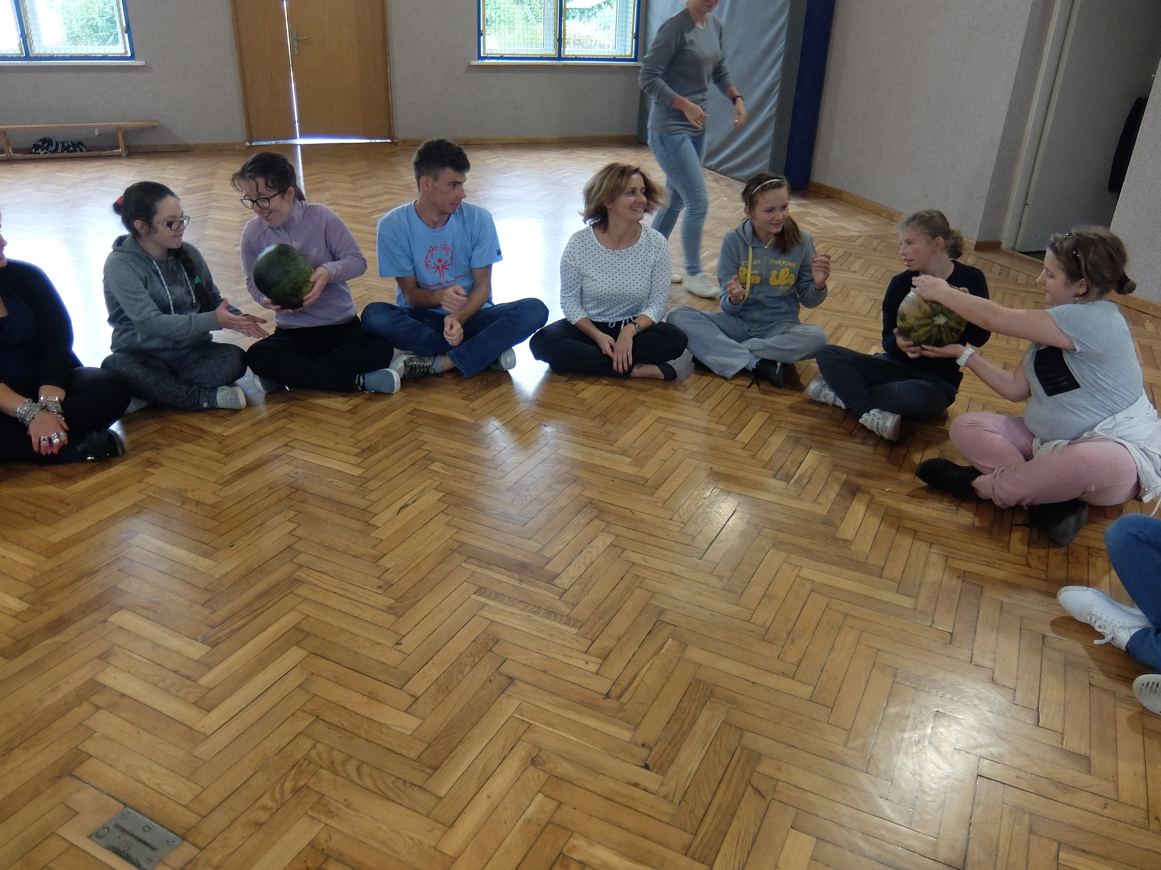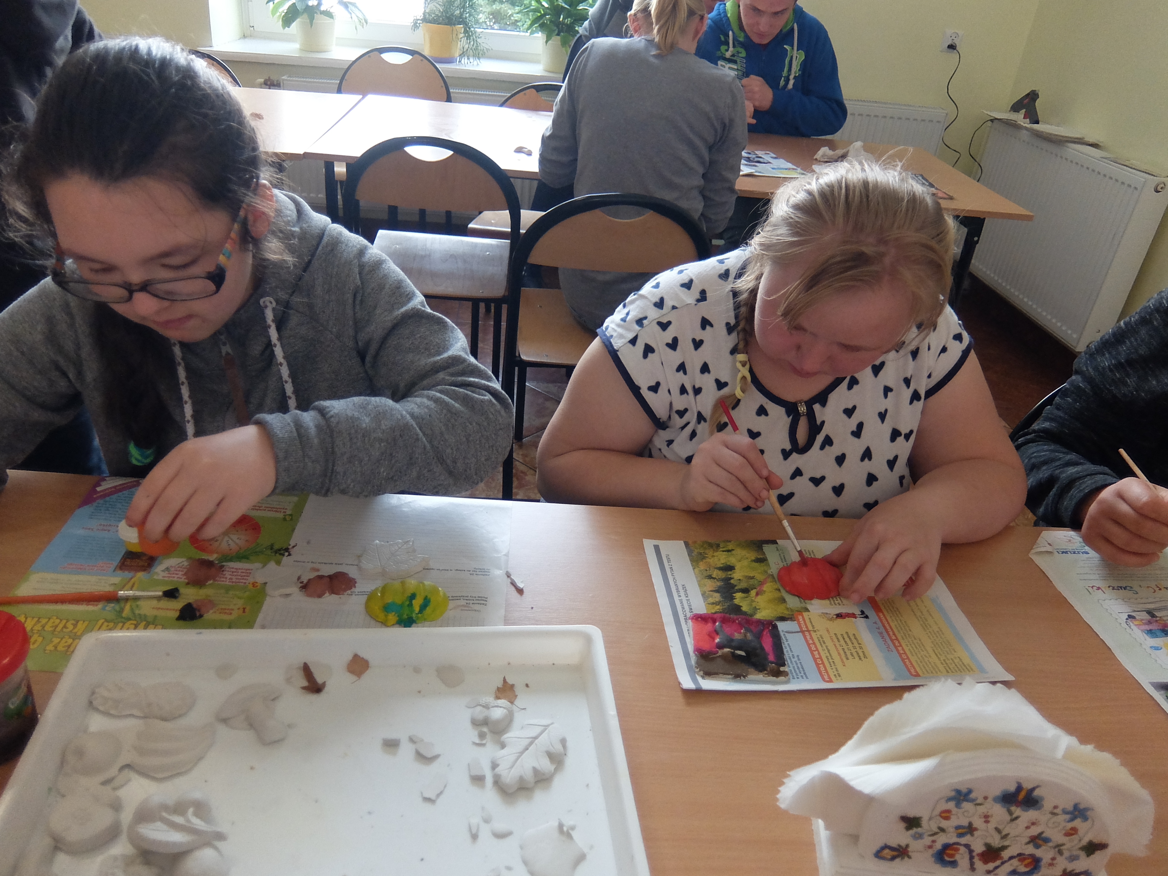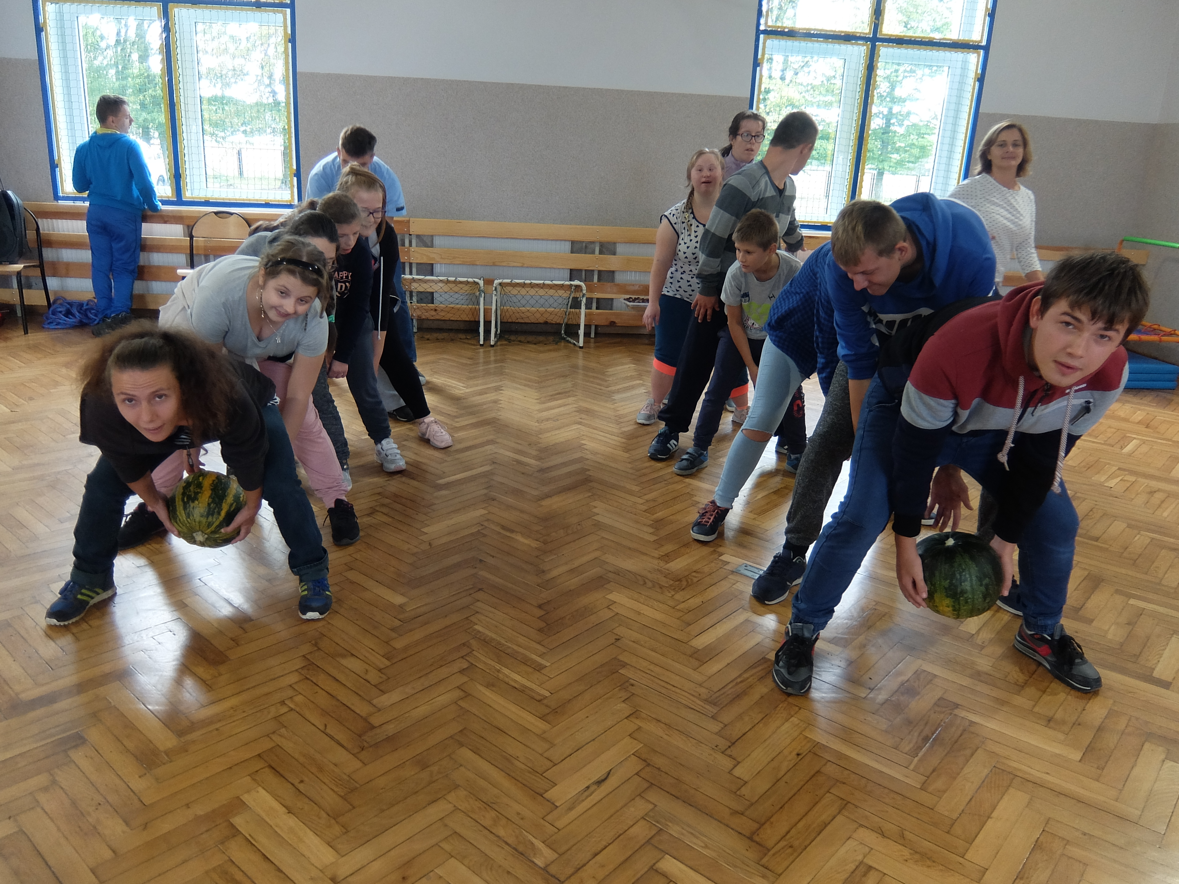 Dnia 22 września do naszego Ośrodka zawitali goście z zaprzyjaźnionego Specjalnego Ośrodka Szkolno – Wychowawczego w Międzyrzecu Podlaskim. Przyjechało do nas pięciu wychowanków z Paniami: Izabelą Korolczuk     i Karoliną Lecyk. Dla nich to była wielka wyprawa – przybyli  pociągiem  do Chotyłowa, a następnie spacerkiem przez Zalutyń dotarli do naszego Ośrodka. Powitaliśmy ich serdecznie. Na początek rozpaliliśmy ognisko,  na którym piekliśmy kiełbaski. Po posiłku nastąpił czas zabaw i konkursów, w których rekwizytami były „dary jesieni” – dynie, liście, kasztany. Śmiechu było co nie miara. Na zakończenie spotkania panie Agnieszka Lewkowicz i Joanna Kulawczuk przeprowadziły zajęcia plastyczne – malowaliśmy przygotowane wcześniej odlewy gipsowe, oczywiście również w klimacie jesiennym.